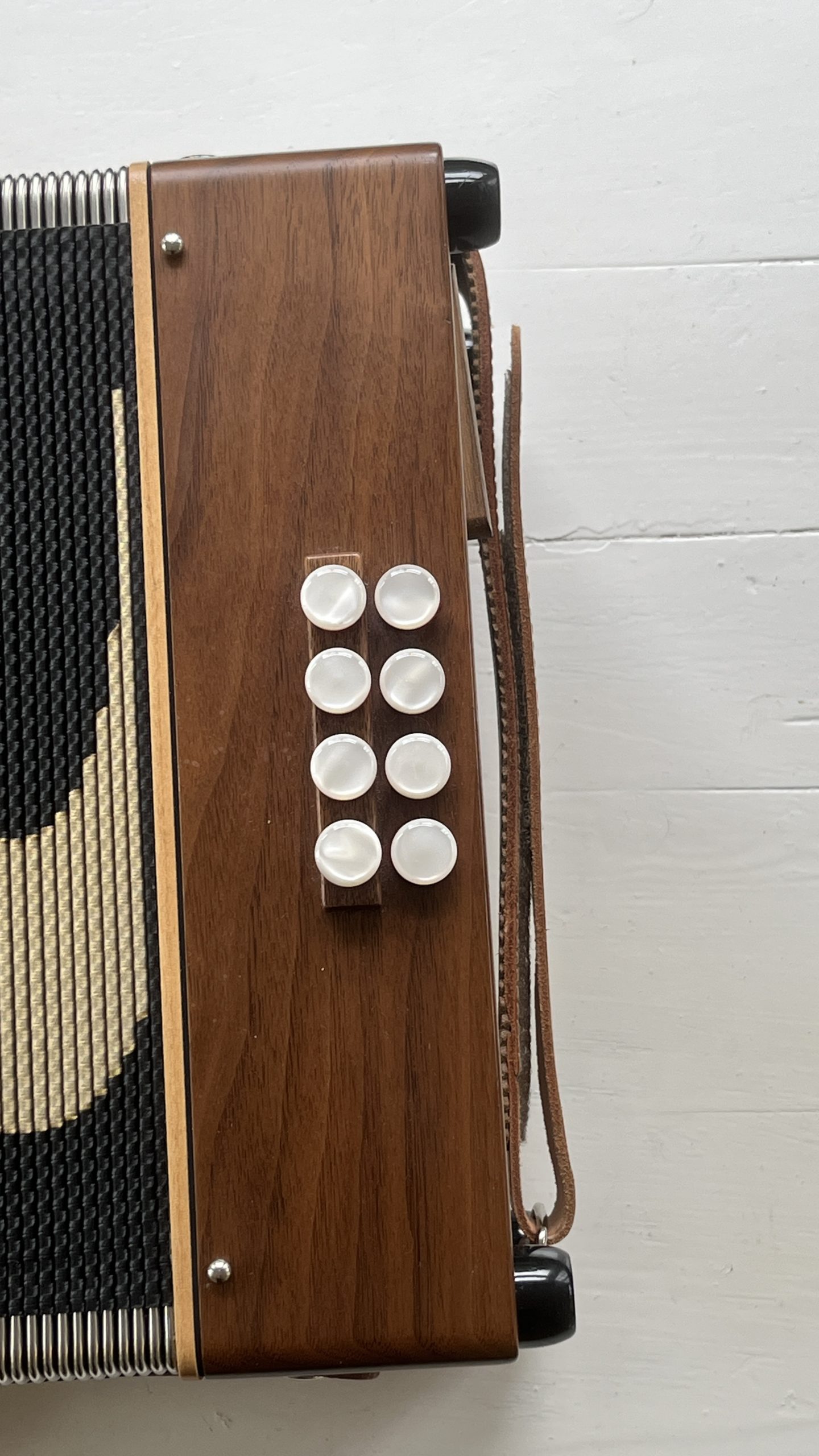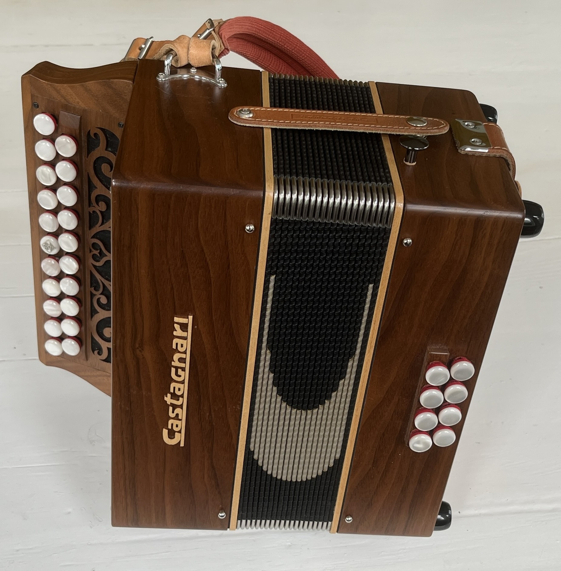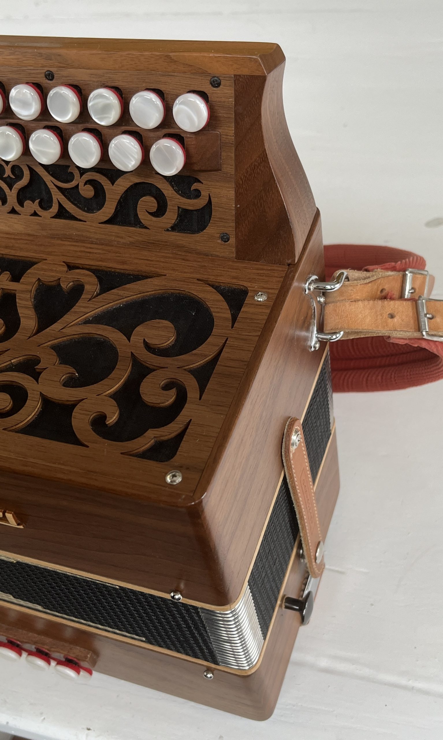 2-rivinen harmonikka, G-vireinen, 442 Hz. Soittimen mukana tulee kova kotelo.