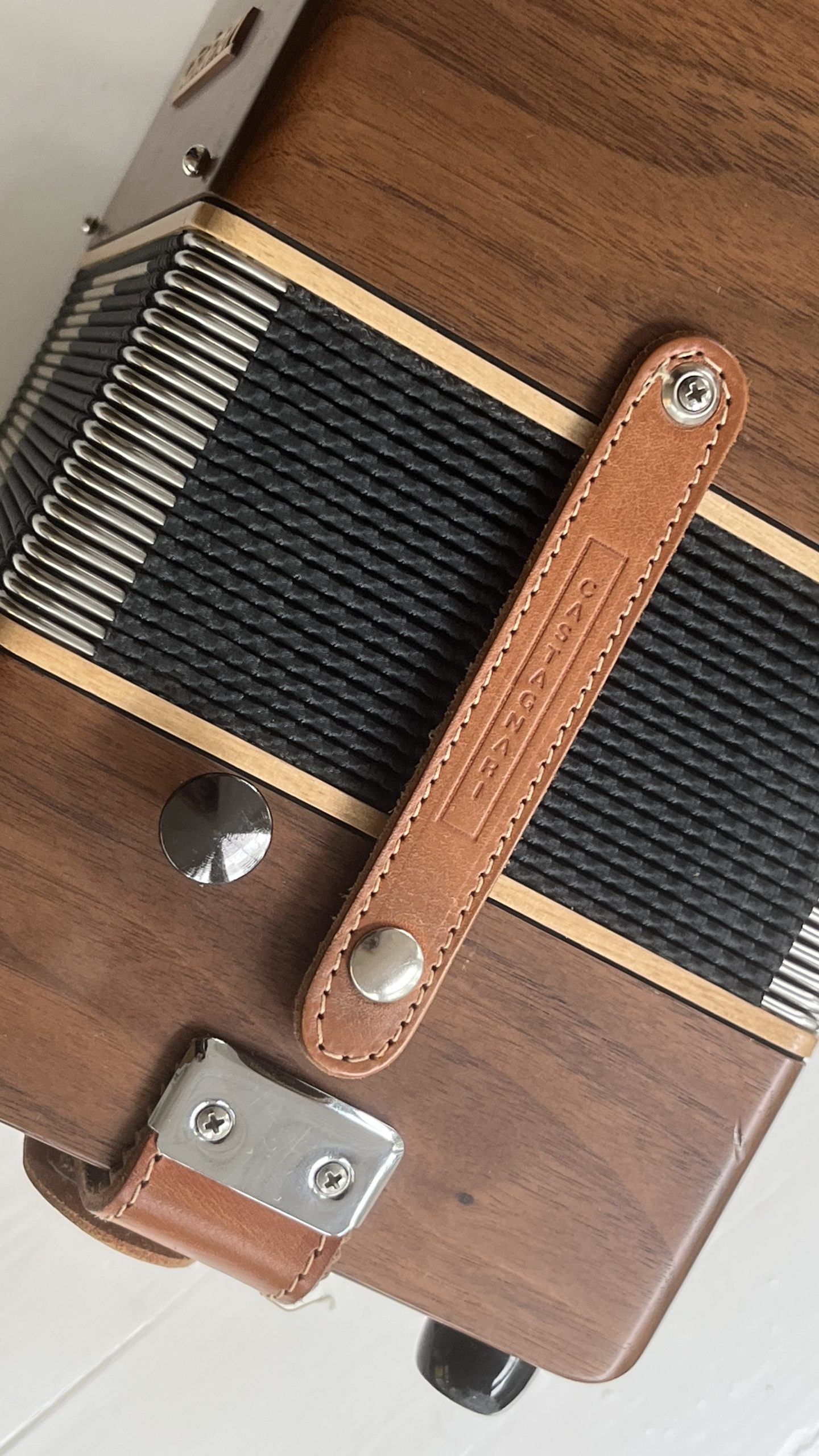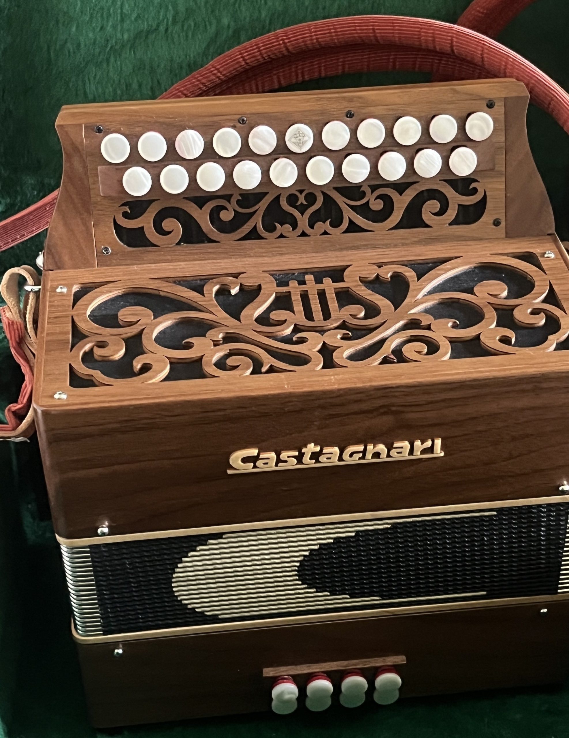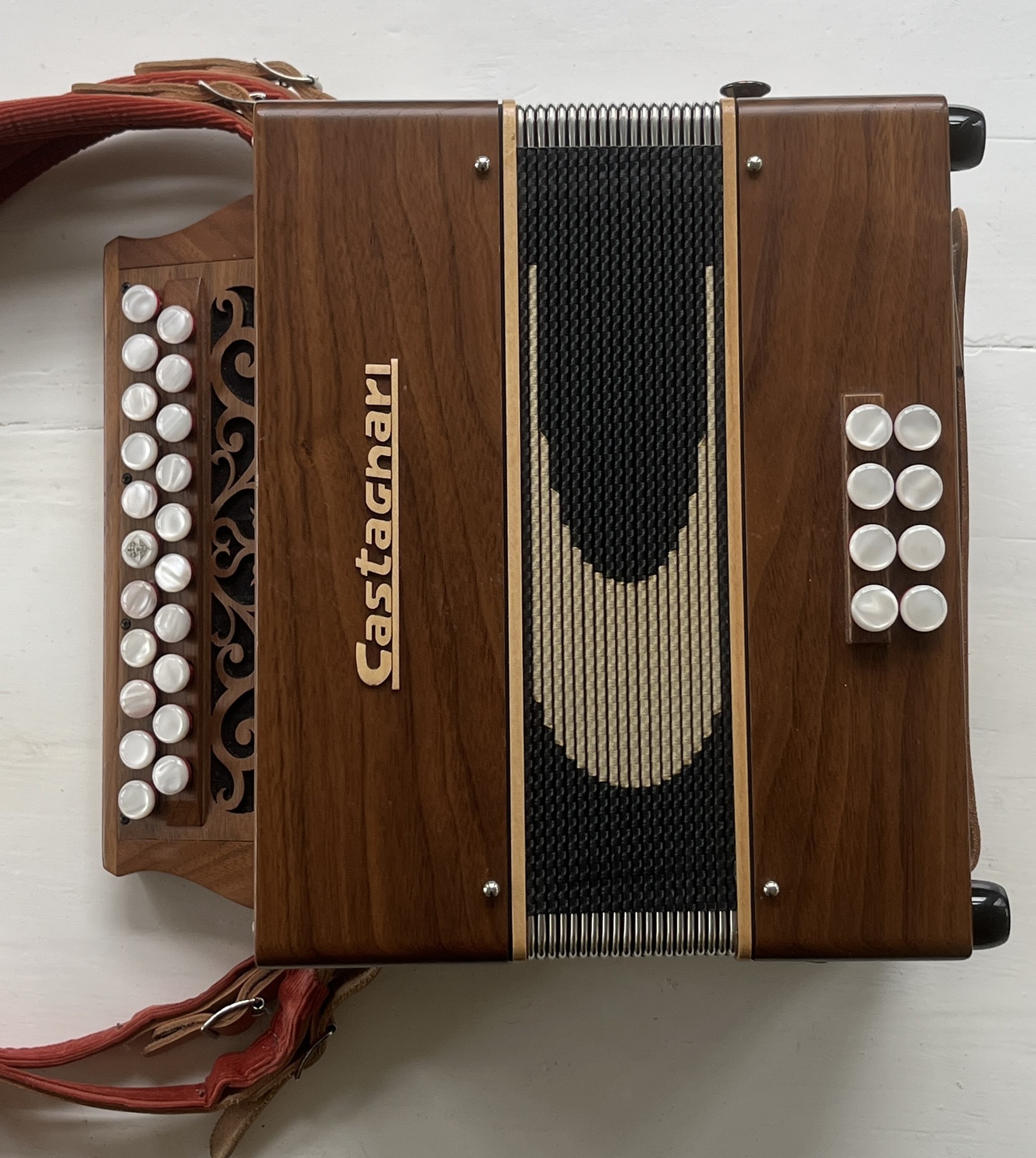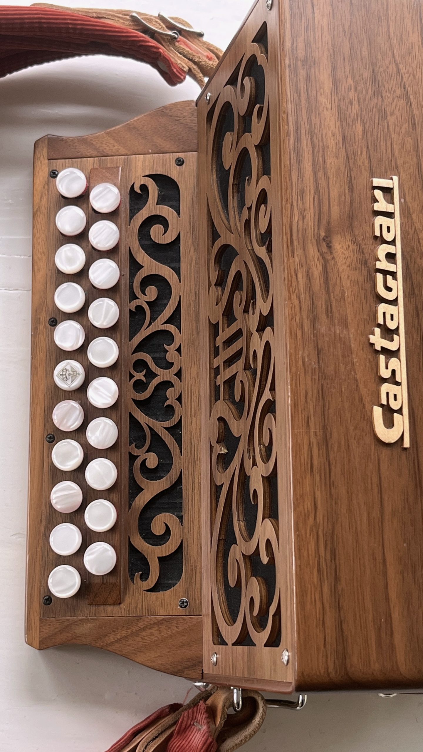 2-rivinen harmonikka, G-vireinen, 442 Hz. Soittimen mukana tulee kova kotelo.