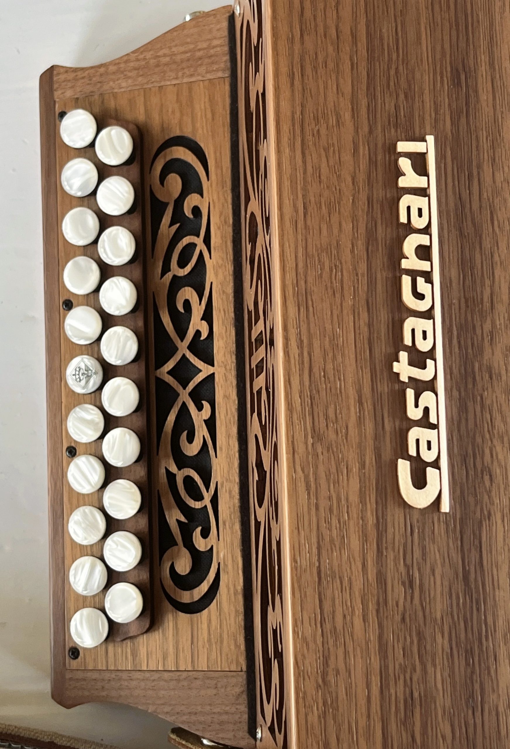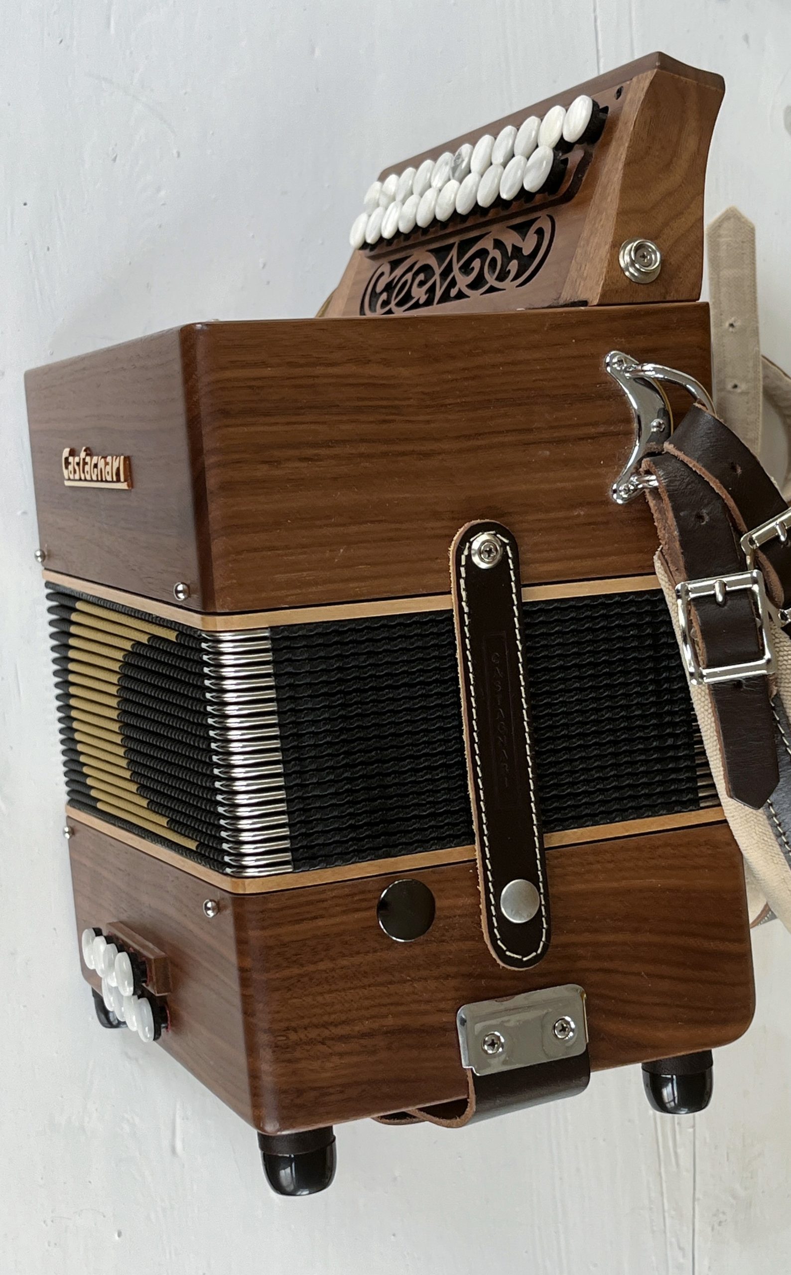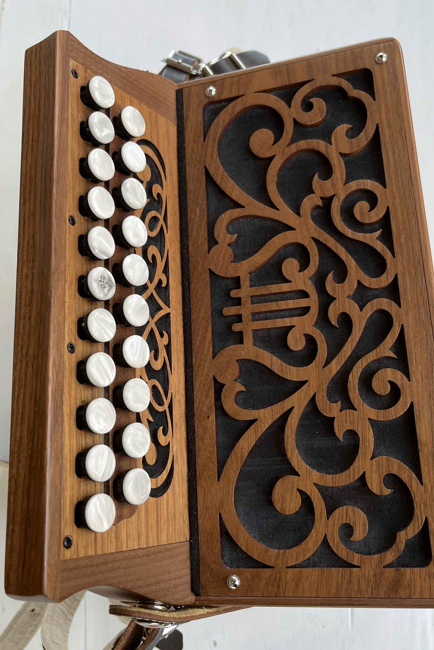 2-rivinen harmonikka, G-vireinen, 442 Hz. Bassopuolen terssirekisteri mahdollistaa myös avosointujen soittamisen. Soittimen mukana olkahihnat ja reppumallinen laukku.
